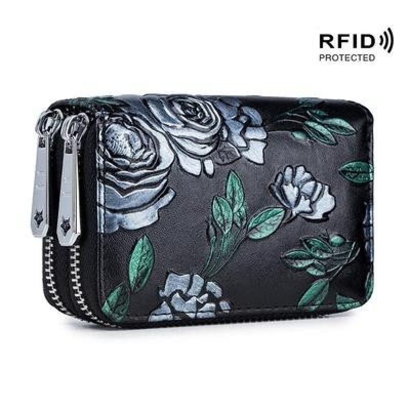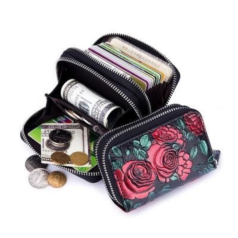 Мода әйелдерге арналған тері кредит карталарын ұстаушы әмиян, қос ZIP, үлкен сыйымдылықты, 3D раушан