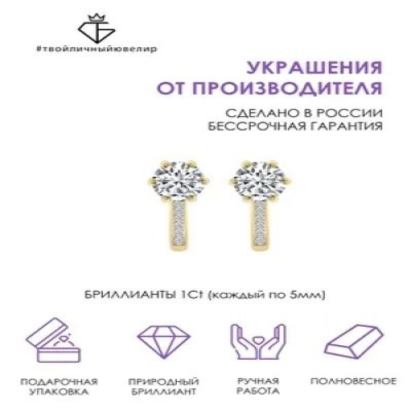 Золотые серьги с бриллиантами бренда ТВОЙЛИЧНЫЙЮВЕЛИР наполнены мощной энергетикой - подойдут для девушек и женщин, которые выбирают яркость и эффектность. Роскошное и в то же время лаконичное ювелирное украшение, выполненное из желтого золота 585 пробы, подчеркнет Вашу неповторимость и откроет новые возможности для стильных экспериментов. В качестве вставки в серьгах используются бриллианты, способные на свету переливаться всеми цветами радуги и издавать невероятный блеск, придавая своей обладательнице женственность и элегантность. Дизайнерские сережки, выполненные опытными ювелирами России, оснащены удобной и надежной английской застежкой, которая обеспечивает прочную фиксацию ювелирного изделия на Вашем ушке. Тип конструкции делает золотые серьги самыми удобными - они не мешают одеваться, не цепляют волосы и, при правильном подборе размера, не доставляют дискомфорта во время сна. Именно по этой причине серьги из золота часто выбирают не только для взрослых девушек, но и для маленьких модниц. Благодаря минималистичному, продуманному дизайну серьги-гвоздики можно легко сочетать с любыми другими украшениями и нарядами. Такие пусеты из золота никогда не выйдут из моды и всегда будут актуальны. Сережки-гвоздики – одни из самых популярных моделей, они универсальны, и их легко подобрать под любой типаж и образ, стиль одежды, возраст владелицы. Аккуратные и практичные пусеты с бриллиантом - это универсальное украшение для любого образа:  на деловой встрече в комбинации со строгим офисным нарядом, на романтическом свидании, и даже на роскошном приеме. Небольшой размер сережек подчеркивает женственность владелицы и ее элегантность при любых обстоятельствах. Бриллиантовые пусеты идут всем без исключения: блондинкам и брюнеткам, смуглым и светлокожим девушкам, голубоглазым и кареглазым. Если вы хотите быть в центре внимания или же ищете украшение на торжественное мероприятие, то серьги с драгоценными камнями — это ваш вариант! Пусеты поставляются в брендированной упаковке и идеально подходят в качестве замечательного подарка на особую дату или просто так, чтобы восхитить и удивить любимую жену, маму или дочку и оставить неизгладимое впечатление. Купив ювелирные изделия от производителя ручной работы, вы получаете бессрочную гарантию! С любовью и заботой о Вас, ТВОЙЛИЧНЫЙЮВЕЛИР!