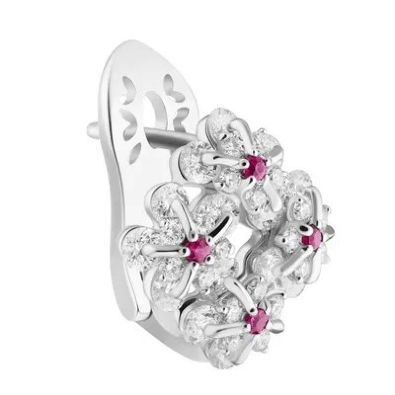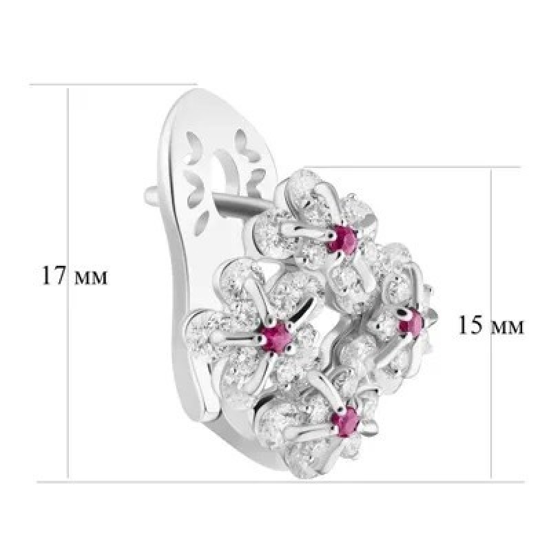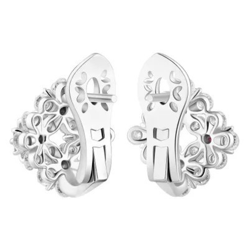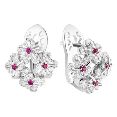 Серьги с английским замком из белого золота 750 пробы, покрытые родием. 72 натуральных бриллианта Кр-57 с общим весом 1,905Ct 3/5, 8 круглых натуральных рубинов 0,110Ct 3/3. Вес изделия 6,92 гр.