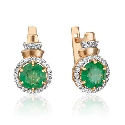 PLATINA Қызыл алтыннан жасалған сырғалар, ағылшын ілмегімен, 585 сынамасы, изумруд пен алмаздармен